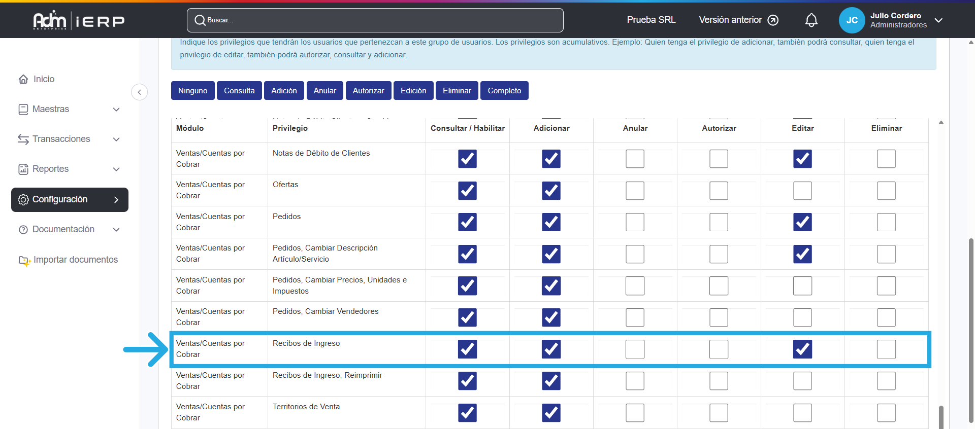 Para crear y gestionar recibos de ingreso es necesario tener habilitado los permisos de esta funcionalidad en el módulo de "Ventas/Cuentas por cobrar".