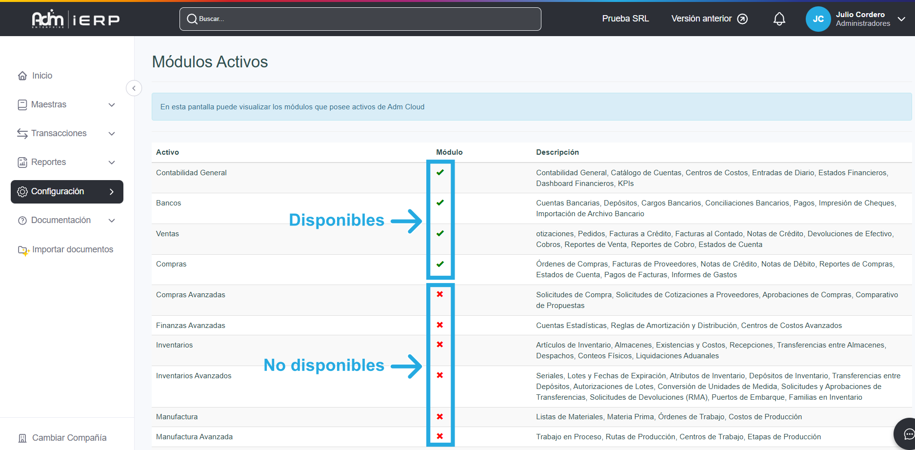 Si utilizas la edición Enterprise, Adm Cloud te permite ver todos los módulos disponibles y cuáles tienes contratados: