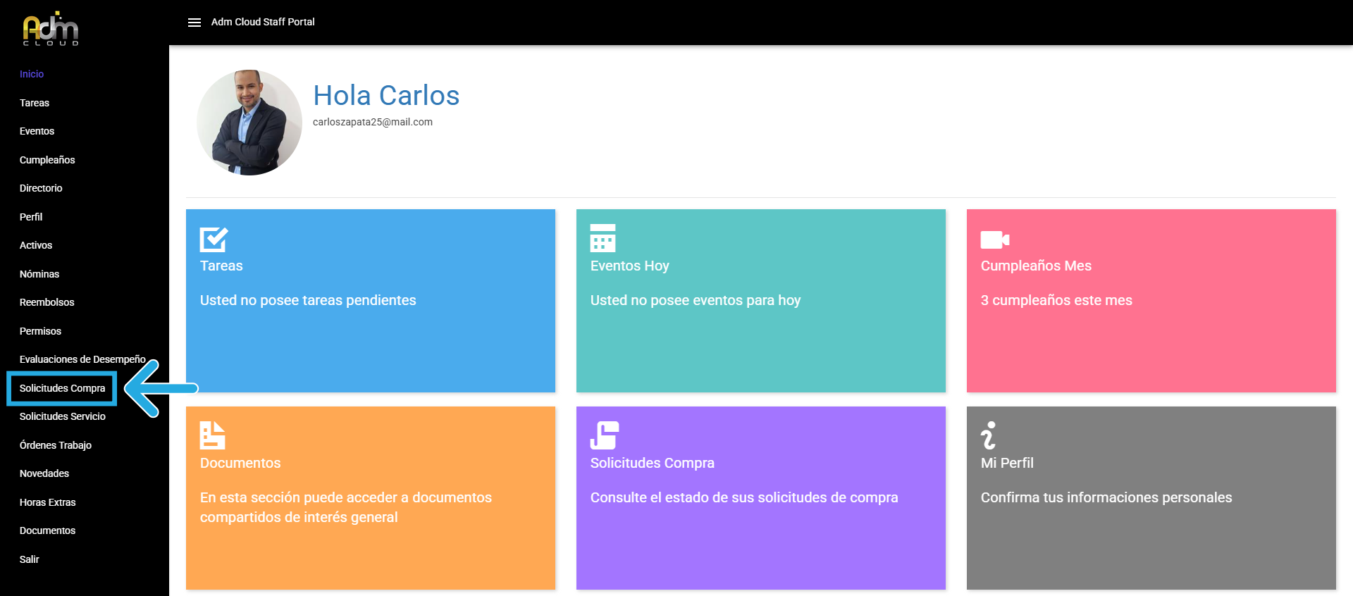Tus colaboradores también pueden generar solicitudes directamente desde el Portal de Staff, en el menú "Solicitudes de compra", lo que facilita el proceso de requerimientos internos sin depender del acceso directo al sistema principal.