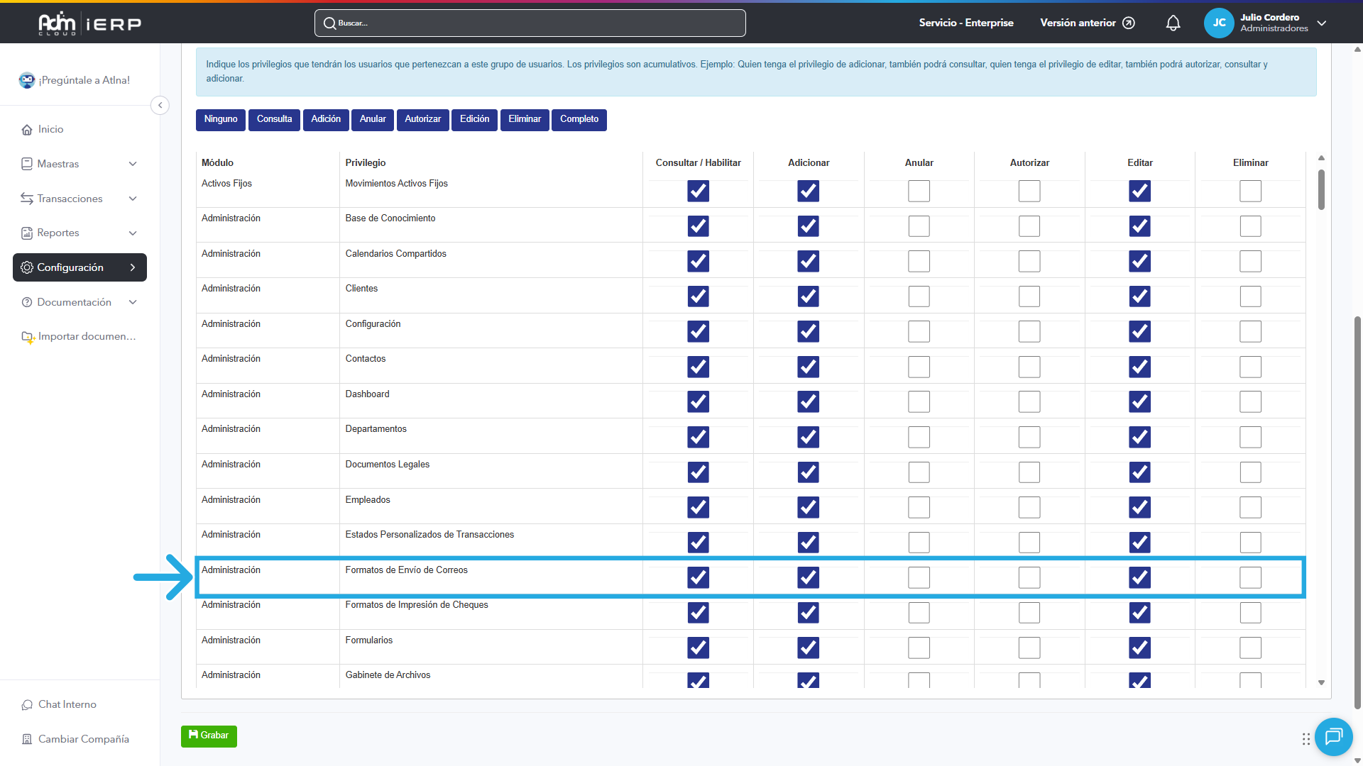 Para crear y gestionar formatos de envío de correos, tu grupo de usuario debe tener habilitado el privilegio “Formatos de envío de correos”, que se encuentra en el módulo de “Administración”.