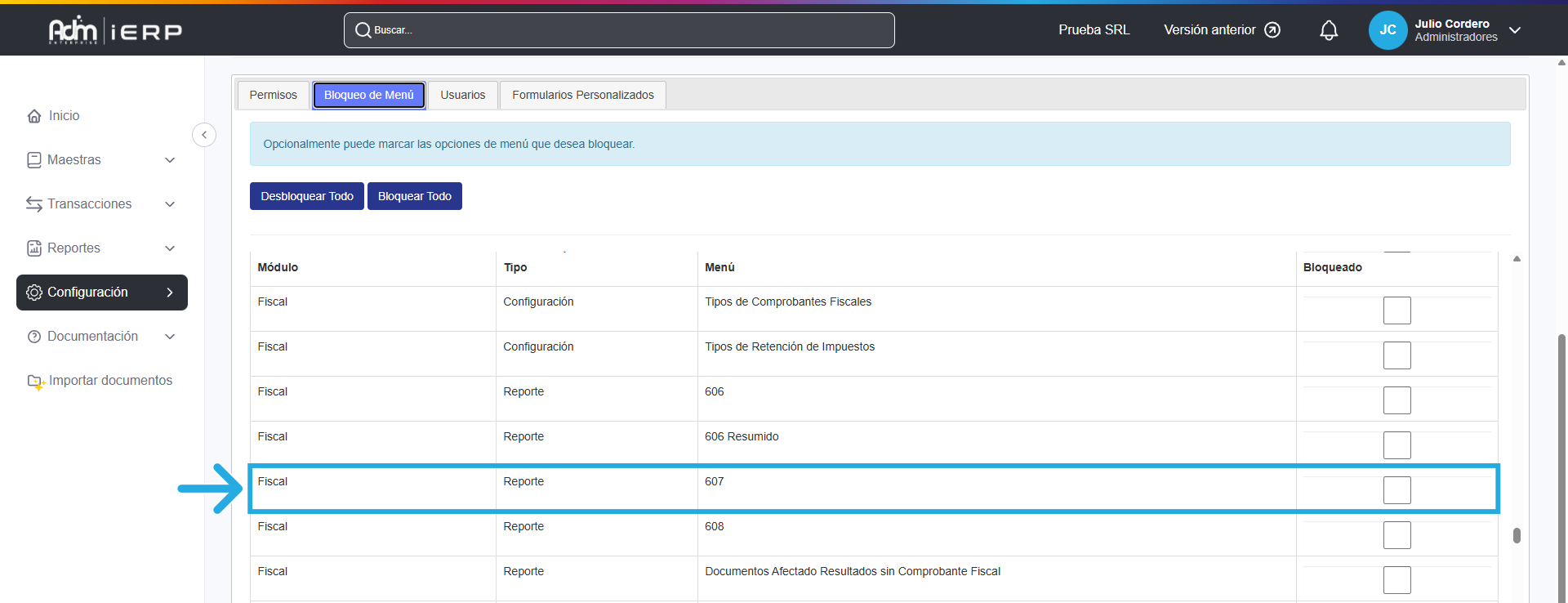 🔹Para generar y visualizar la información de tu Reporte 607, tu usuario no requiere tener un permiso específico; sin embargo, es necesario que el grupo de usuario al que pertenece el tuyo no tenga bloqueado el menú correspondiente a este reporte.