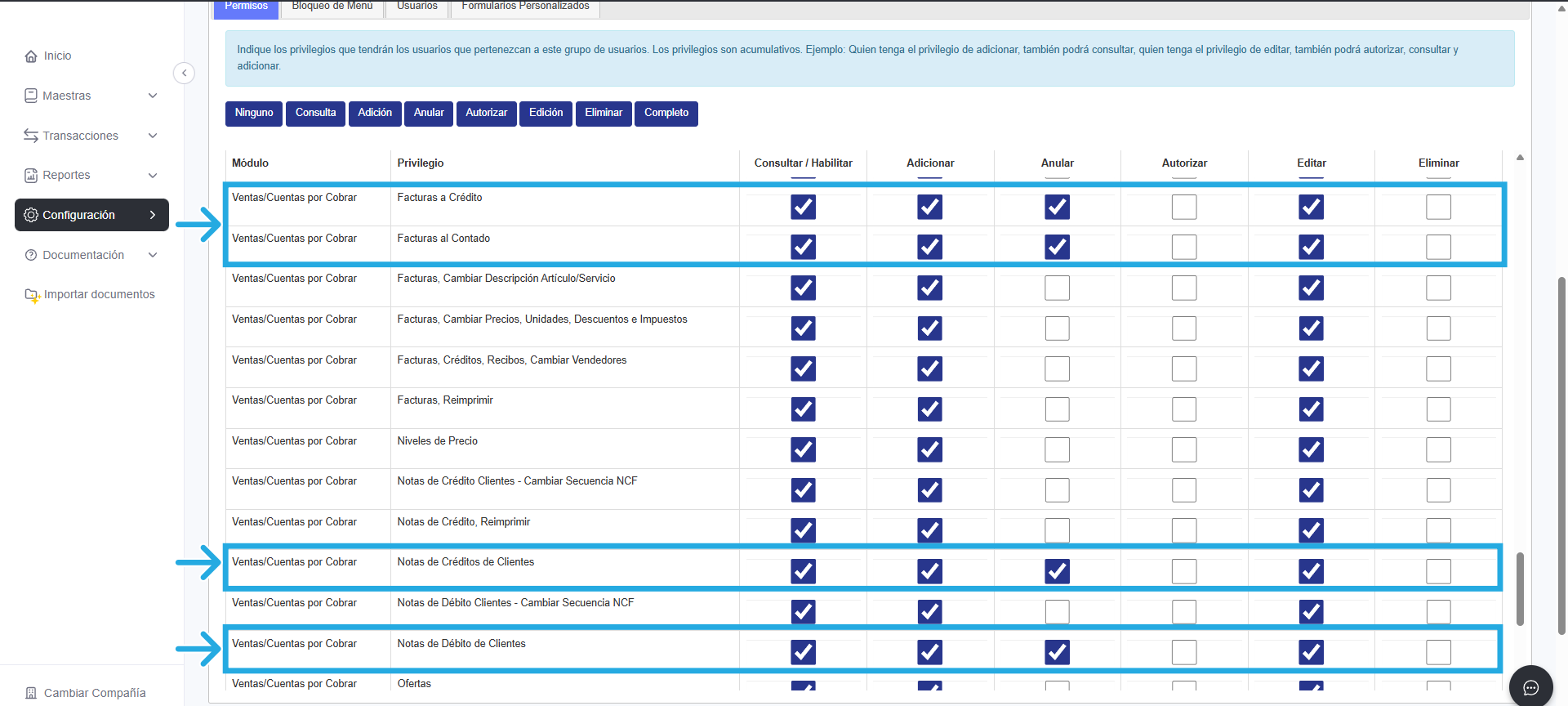 🔹Por otra parte, si necesitas editar facturas a crédito, facturas al contado, notas de débito de clientes o notas de crédito de clientes, debes contar con los permisos asociados a los privilegios que llevan ese mismo nombre en el módulo de Ventas/Cuentas por Cobrar.