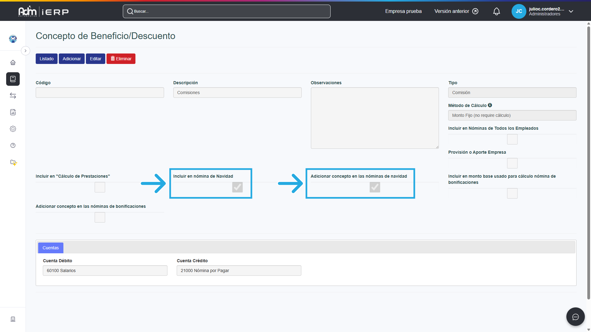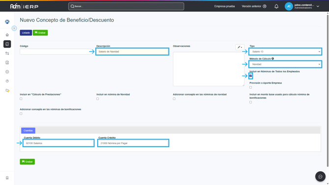 1. Verifica que el concepto “Salario de Navidad” esté creado