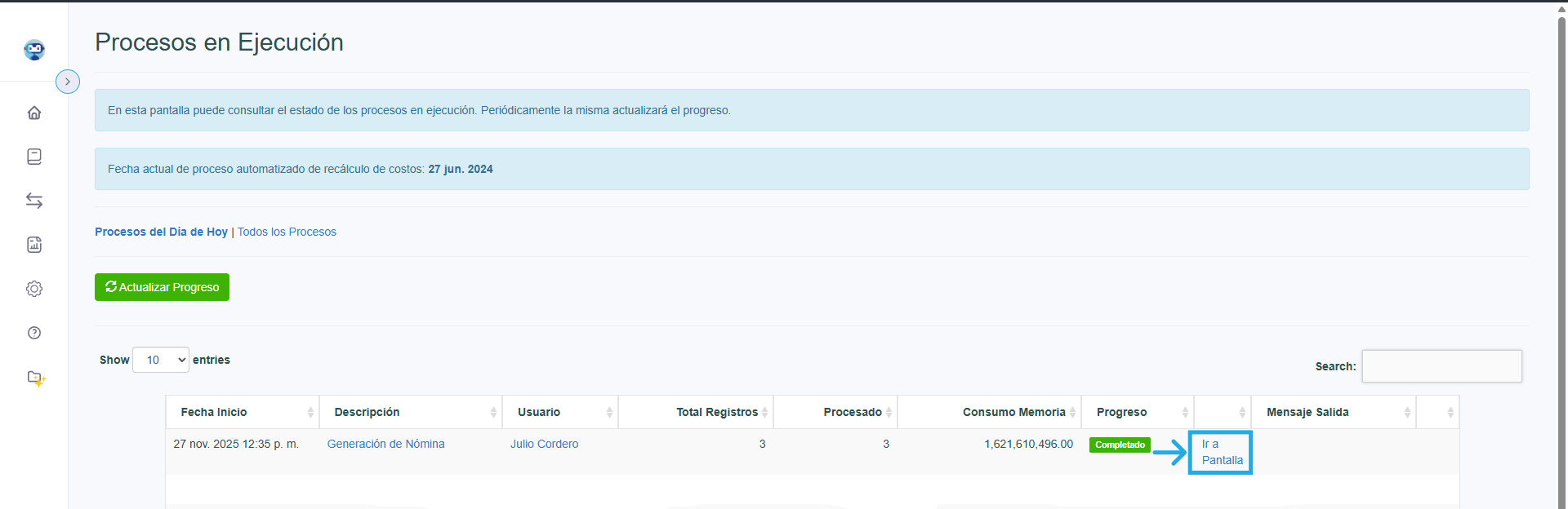 El sistema mostrará una barra de progreso y al llegar al 100% se marcará como Completada.